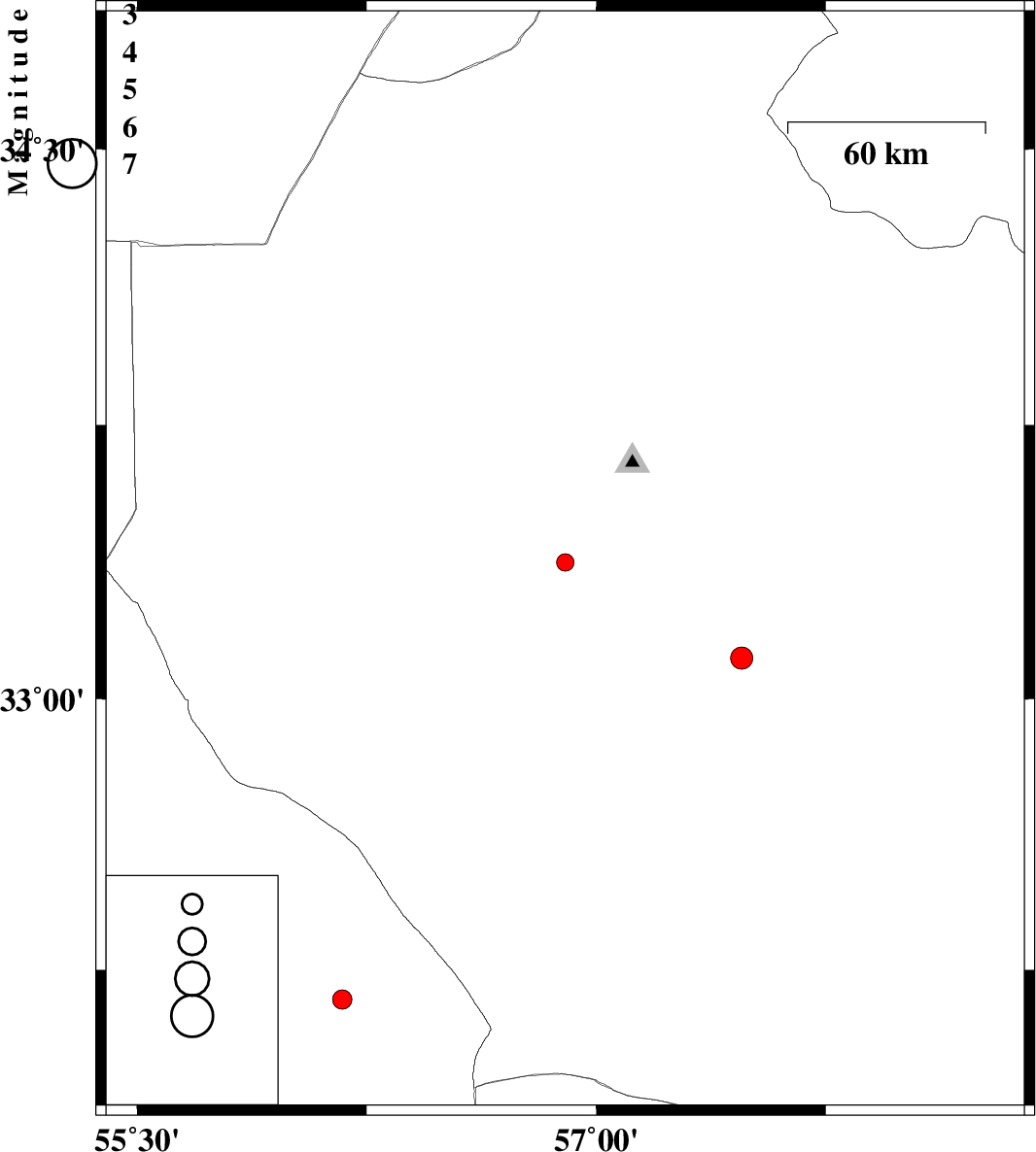 2018/10/14 | 21:55:22.7 | 01:25:22.7 | 33.112 | 57.476 | 14 | ML:3.2 | Yazd Province, 74 km South-East of Tabas | ||