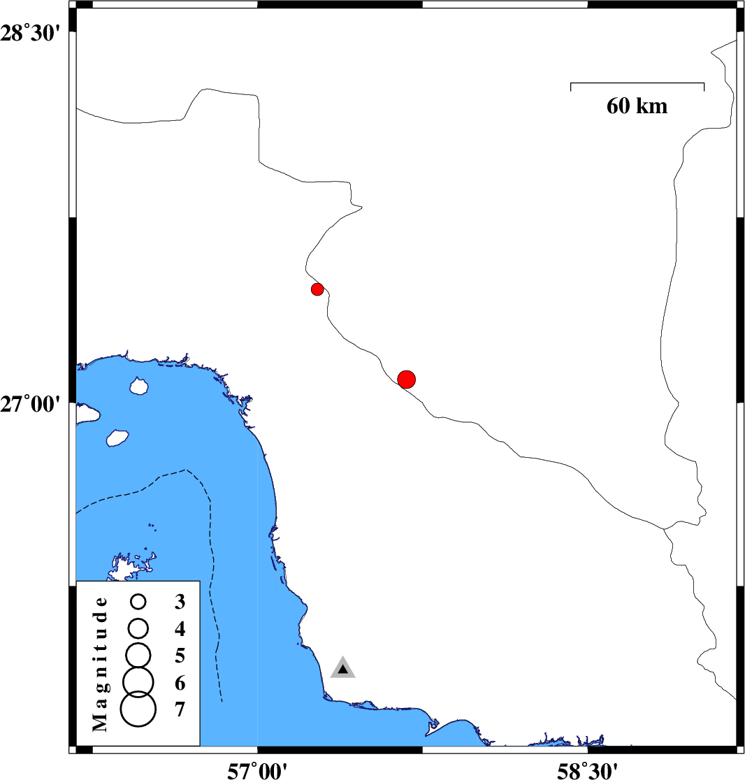2018/10/24 | 15:13:40.2 | 18:43:40.2 | 27.093 | 57.676 | 7 | ML:3.6 | Kerman Province, 40 km South-East of Manujan | ||