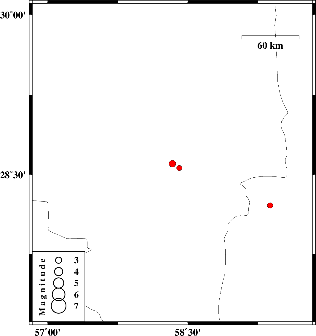 2018/11/04 | 04:33:56.5 | 08:03:56.5 | 28.562 | 58.409 | 14 | ML:2.5 | Kerman Province, 61 km South of Bam | ||