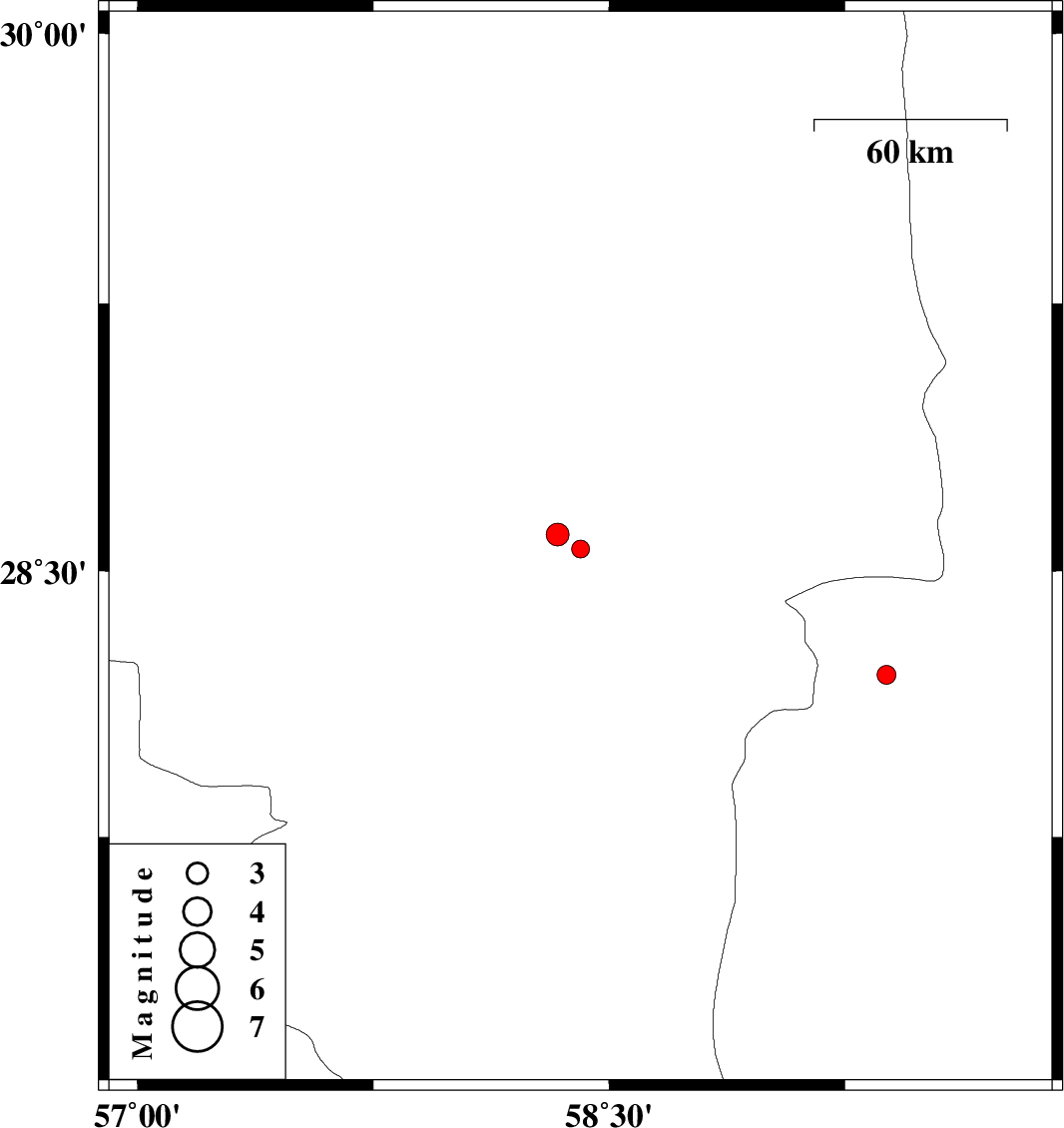 | 2018/11/04 | 02:13:08.1 | 05:43:08.1 | 28.603 | 58.336 | 14 | ML:3.3 | Kerman Province, 56 km South of Bam | ||
