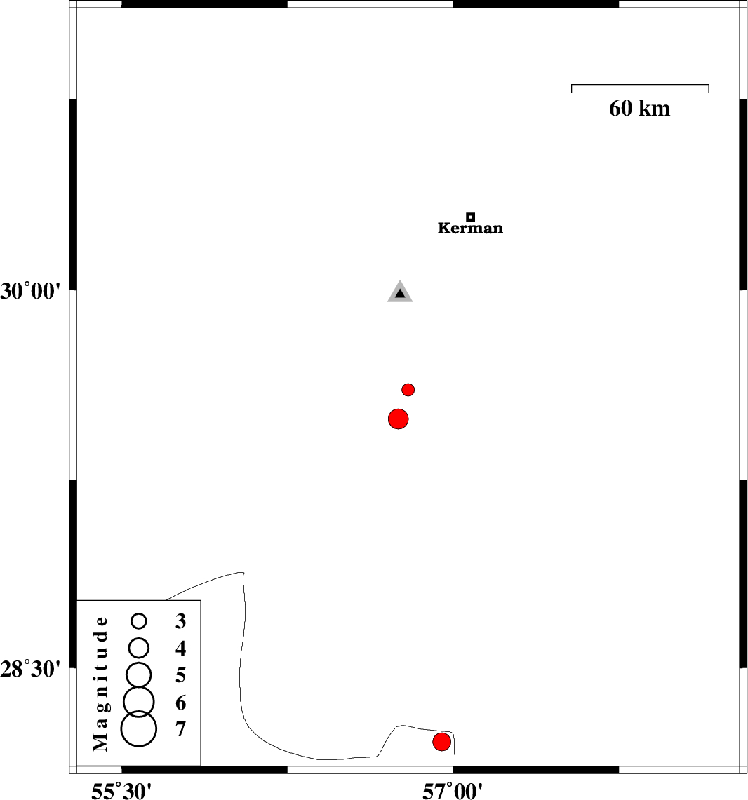 2018/11/09 | 19:25:55.7 | 22:55:55.7 | 29.606 | 56.796 | 14 | ML:2.5 | Kerman Province, 41 km South-East of Bardsir | ||