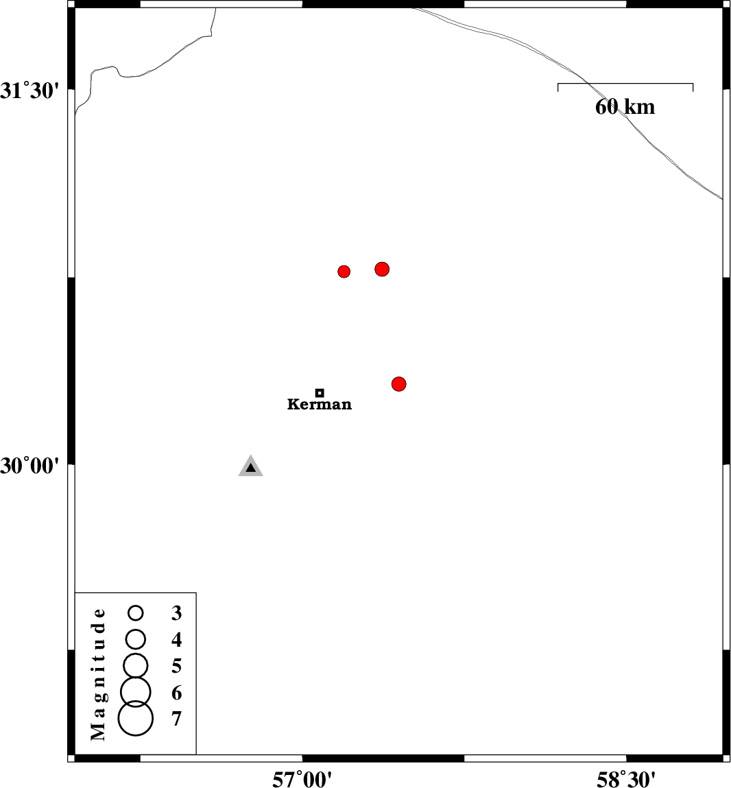 | 2018/11/16 | 16:10:13.3 | 19:40:13.3 | 30.784 | 57.369 | 14 | ML:2.9 | Kerman Province, 62 km North-East of Kerman |