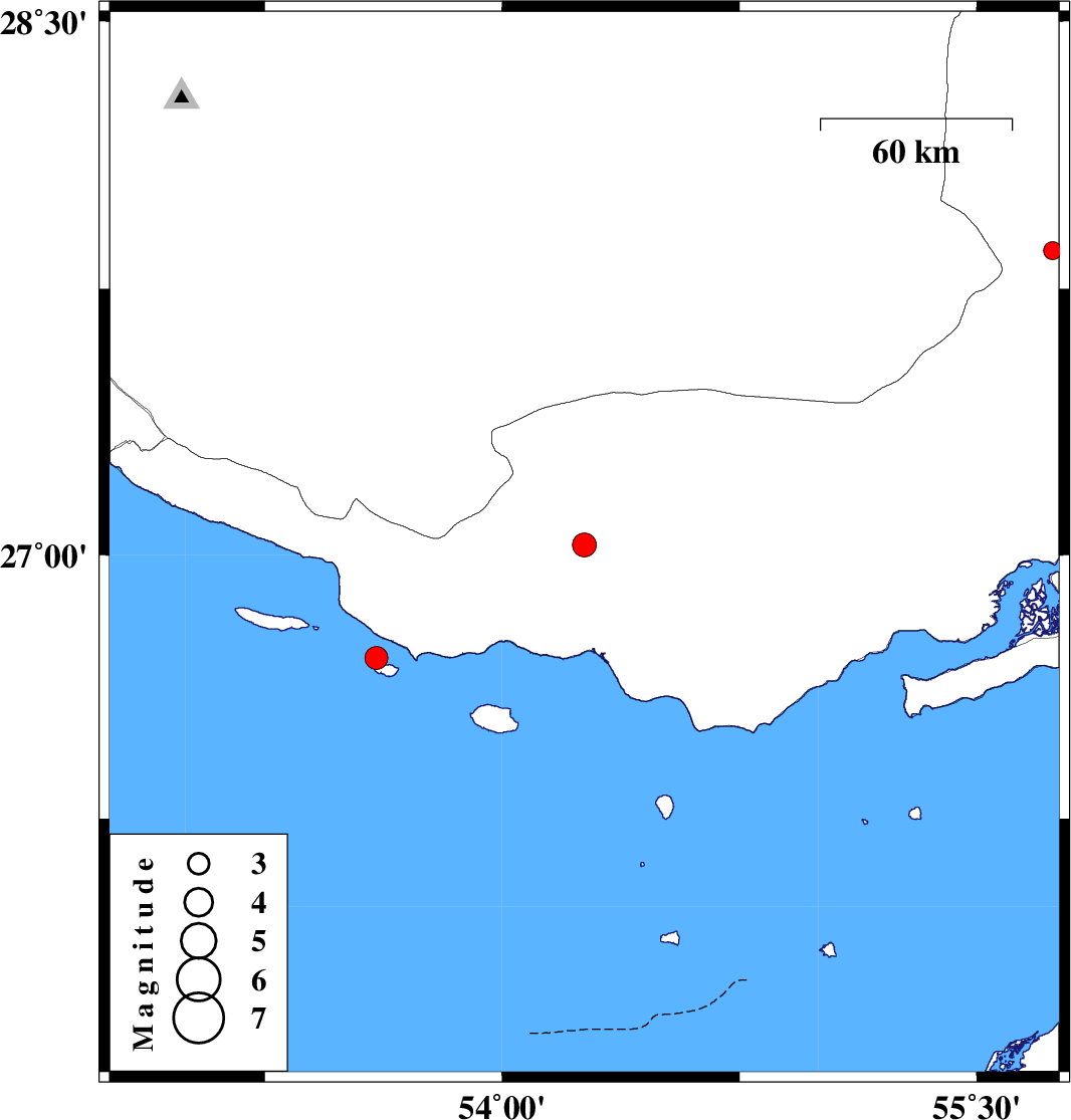| 2018/12/05 | 07:38:51.7 | 11:08:51.7 | 27.028 | 54.26 | 15 | ML:3.4 | Hormozgan Province, 21 km South-West of Bastak | ||