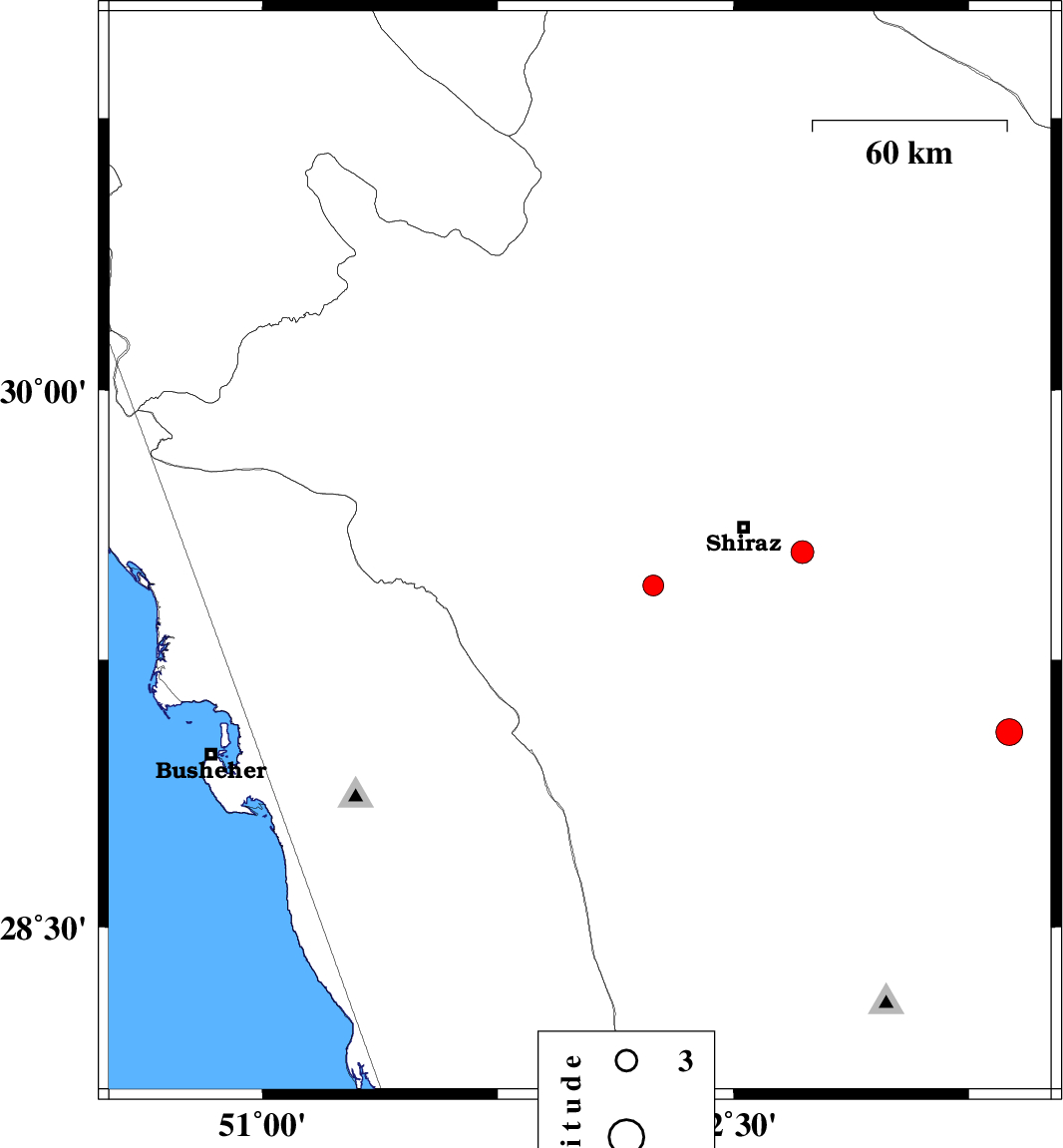| 2018/12/11 | 22:45:34.1 | 02:15:34.1 | 29.545 | 52.011 | 14 | ML:3.8 | Fars Province, 36 km -East of Kazerun | ||