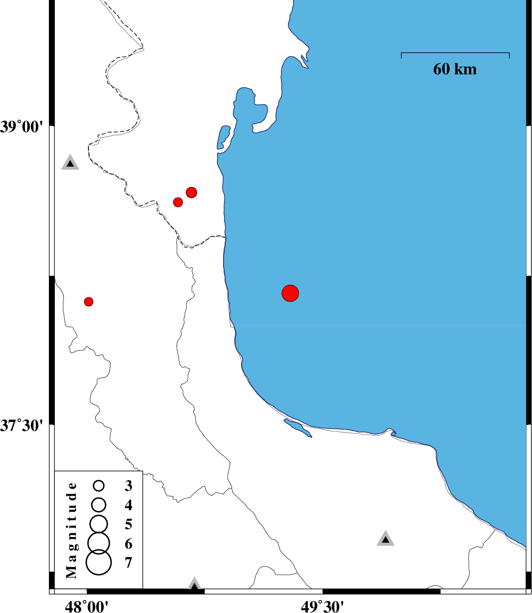 2018/12/17 | 10:03:37.0 | 13:33:37.0 | 38.162 | 49.294 | 15 | ML:4.8 | Caspian Sea, 48 km South-East of Astara | ||