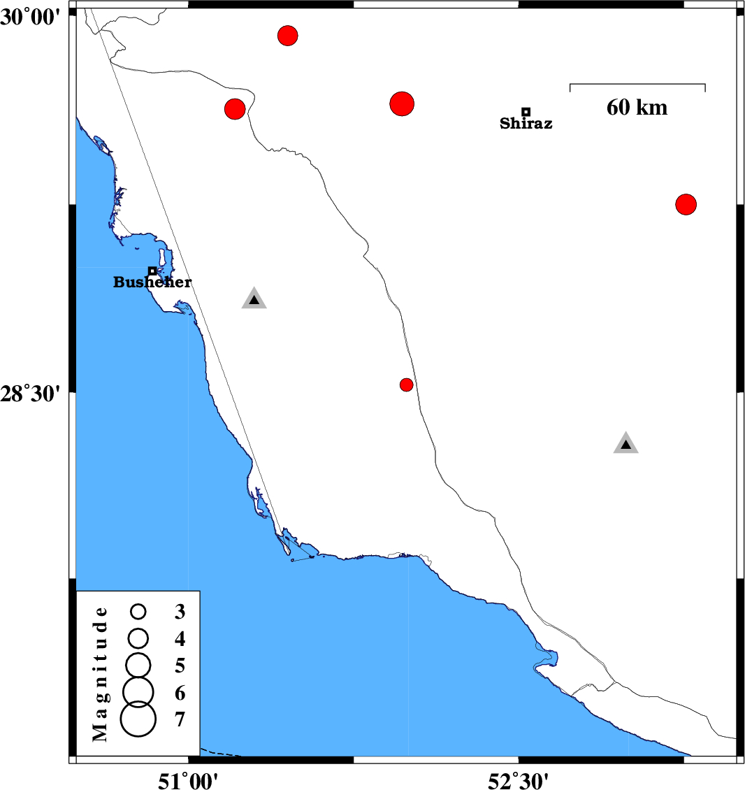 | 2019/05/19 | 04:19:54.0 | 08:49:54.0 | 29.63 | 51.21 | 10 | ML:4.2 | Bushehr Province, 41 km North of Borazjan | ||