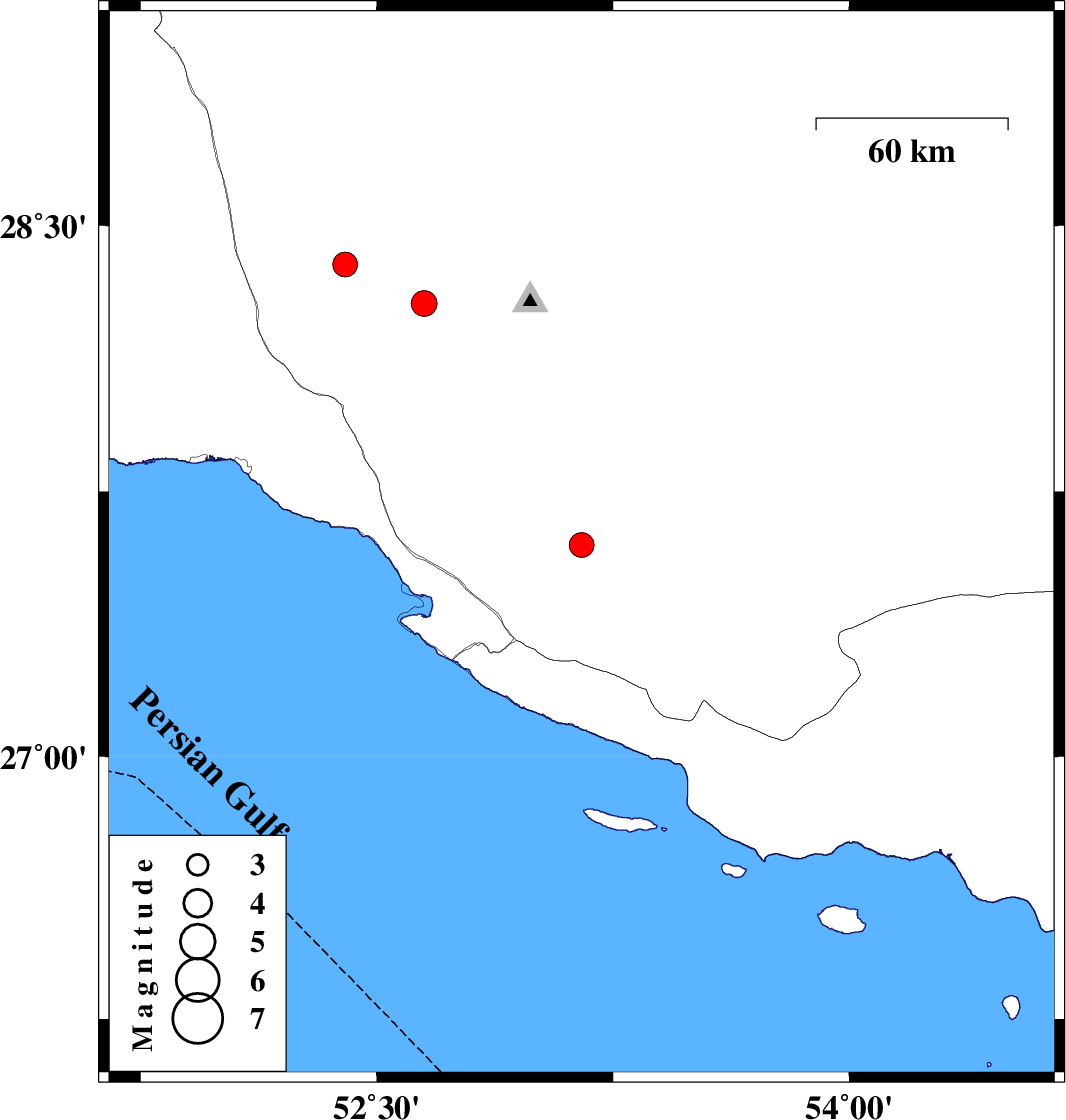 | 2019/06/22 | 06:28:11.5 | 10:58:11.5 | 28.28 | 52.65 | 18 | Mb:3.7 | Fars Province, 43 km South-West of Qir va Karzin |