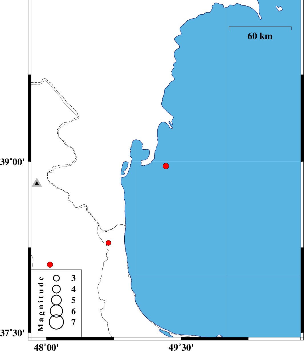 2019/12/08 | 15:33:40.9 | 19:03:40.9 | 38.96 | 49.33 | 13 | ML:2.9 | Caspian Sea, 73 km North-East of Astara | ||
