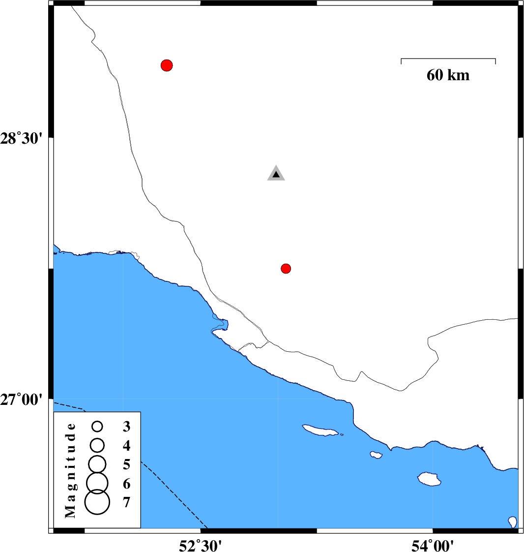 | 2020/04/25 | 00:53:27.8 | 05:23:27.8 | 27.75 | 53.05 | 10 | ML:2.8 | Fars Province, 28 km North-East of Mehr | ||