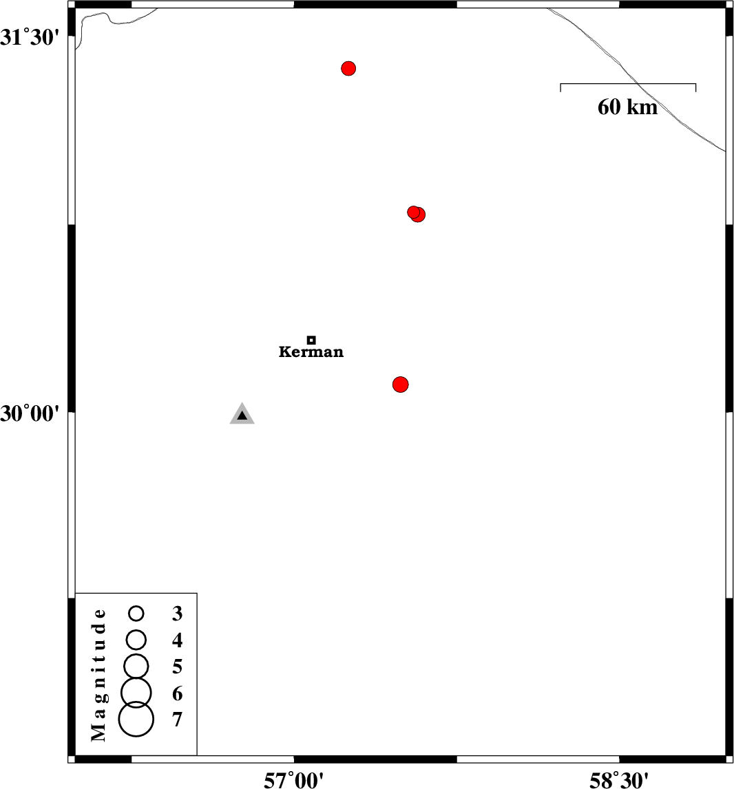 | 2020/04/20 | 05:43:41.9 | 10:13:41.9 | 30.79 | 57.57 | 10 | ML:3.1 | Kerman Province, 73 km North-East of Kerman | ||