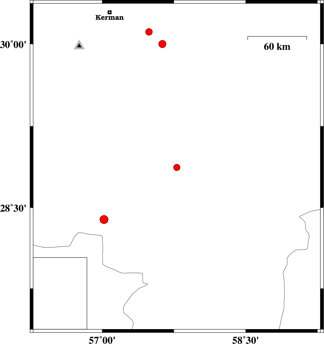 | 2020/05/19 | 05:59:11.0 | 10:29:11.0 | 30 | 57.63 | 10 | ML:3.5 | Kerman Province, 62 km South-East of Kerman | ||