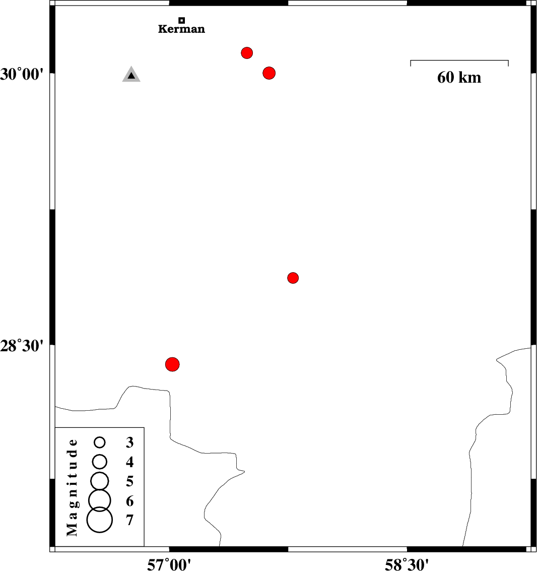 | 2020/05/07 | 21:56:16.7 | 02:26:16.7 | 30.11 | 57.49 | 10 | ML:3.2 | Kerman Province, 44 km South-East of Kerman |