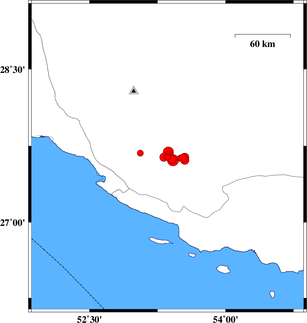 2020/06/10 06:46:55.5 11:16:55.5 27.6453.3610 ML:2.9 Fars Province, 39 km North-East of Lamerd