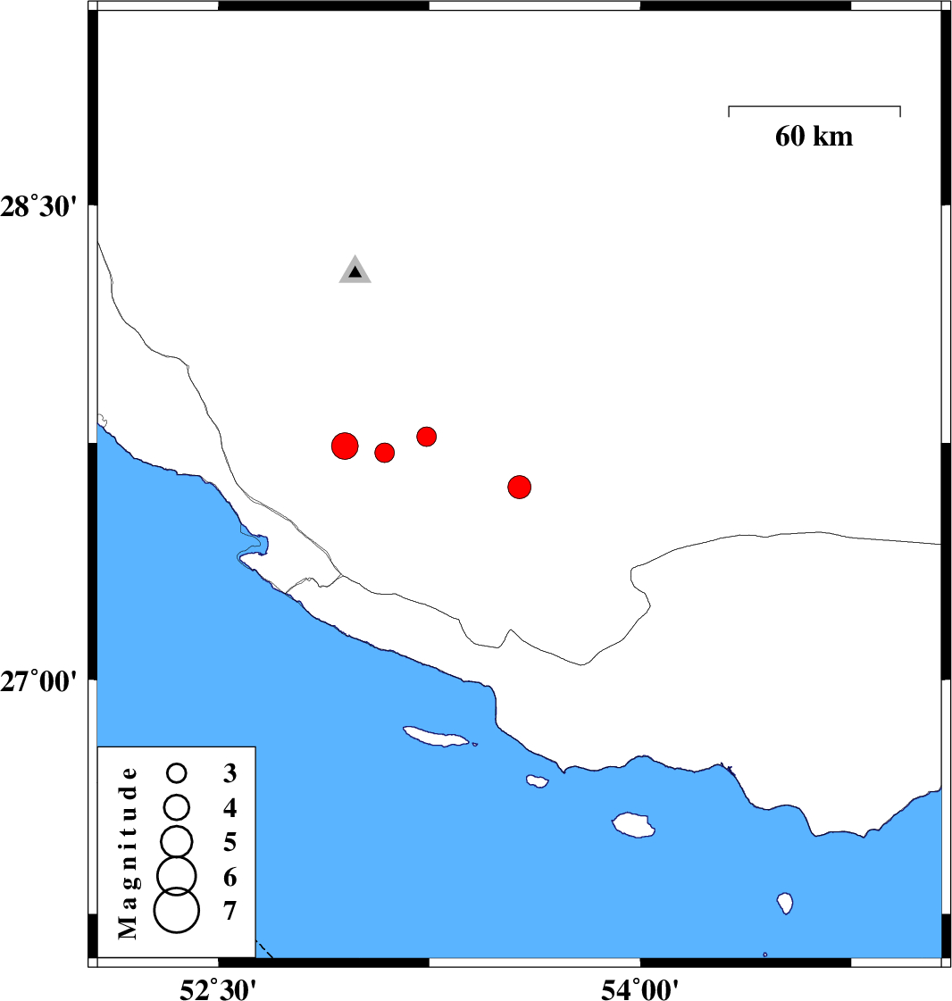| 2020/07/02 | 00:29:16.7 | 04:59:16.7 | 27.741 | 52.949 | 12 | ML:4.2 | Fars Province, 22 km North of Mehr | ||