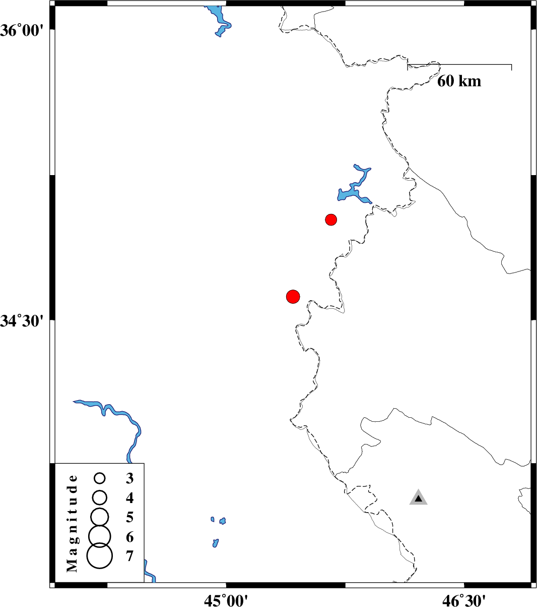 | 2020/08/01 | 08:37:59.9 | 13:07:59.9 | 34.62 | 45.42 | 16 | ML:3.8 | Iraq, 19 km North-West of Qasr-E-Shirin | ||