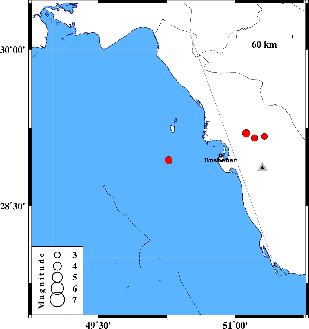 | 2020/08/10 | 06:40:32.1 | 11:10:32.1 | 28.94 | 50.27 | 22 | ML:3.7 | Persian Gulf, 55 km -West of Busheher | ||