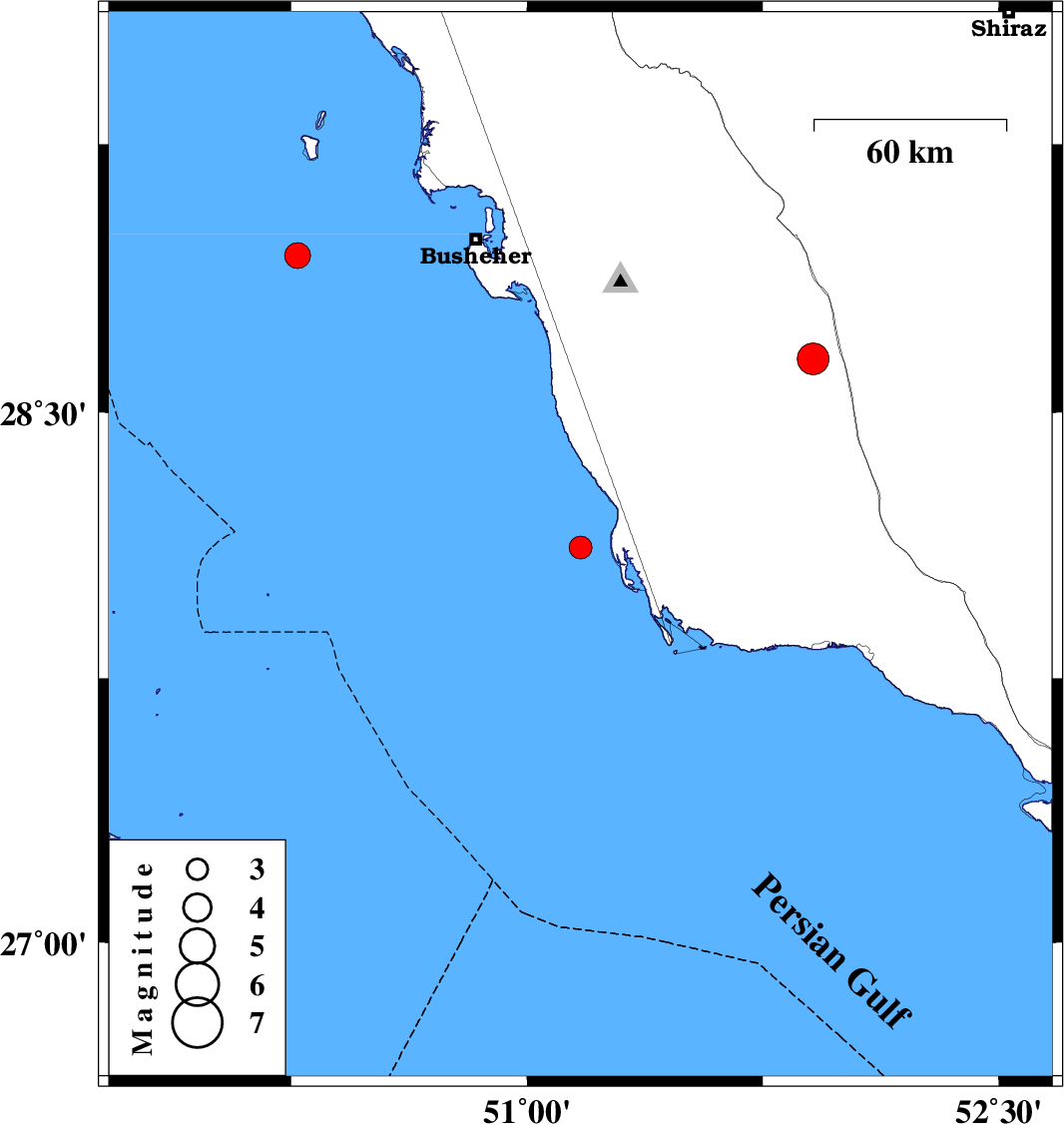 | 2020/08/10 | 06:40:32.1 | 11:10:32.1 | 28.94 | 50.27 | 22 | ML:3.7 | Persian Gulf, 55 km -West of Busheher |
