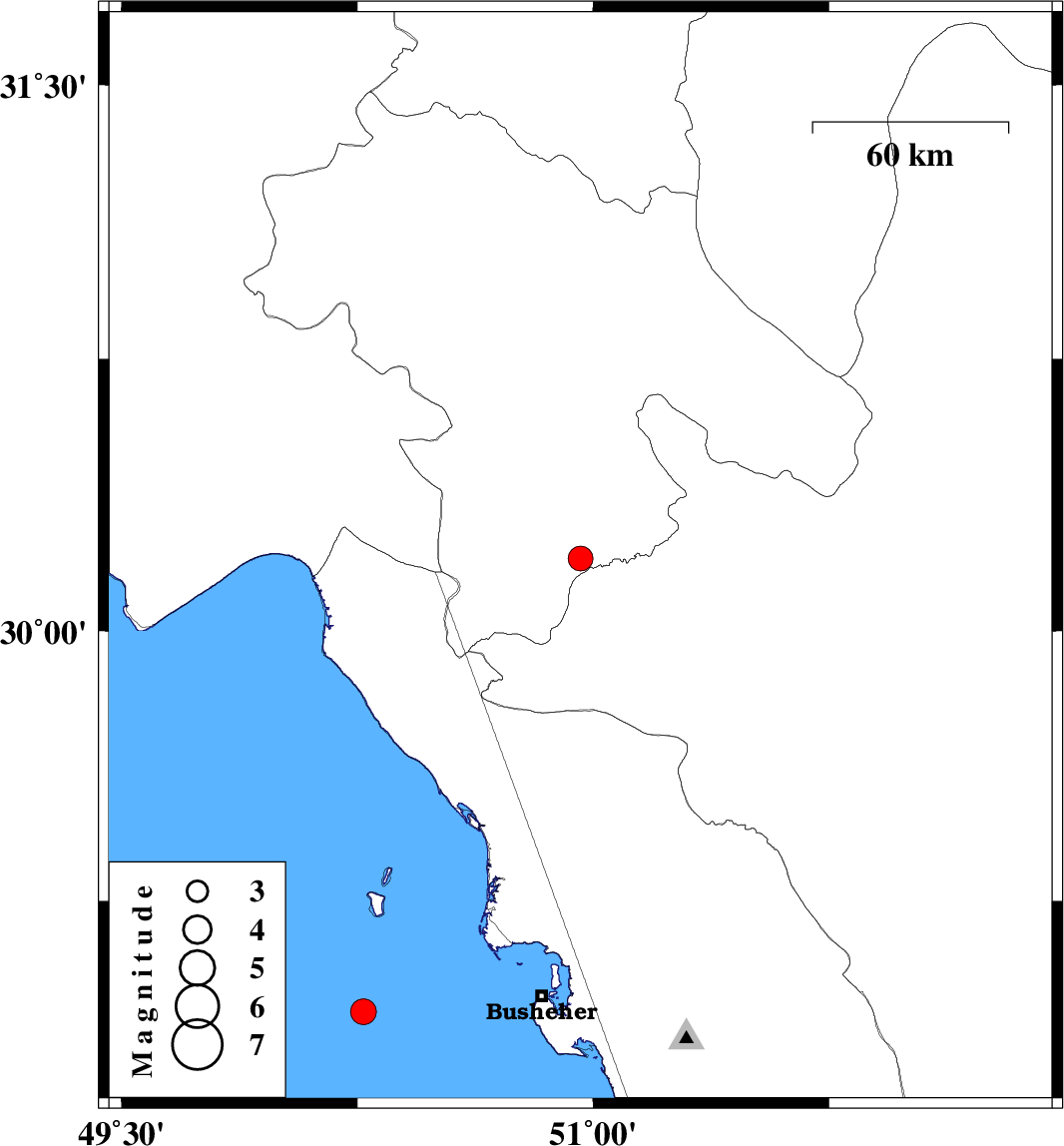 | 2020/08/10 | 06:40:32.1 | 11:10:32.1 | 28.94 | 50.27 | 22 | ML:3.7 | Persian Gulf, 55 km -West of Busheher |