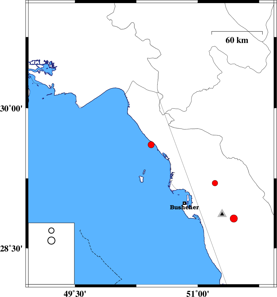 | 2020/08/20 | 08:23:45.9 | 12:53:45.9 | 29.2 | 51.21 | 14 | ML:3.1 | Bushehr Province, 7 km of Borazjan | ||
