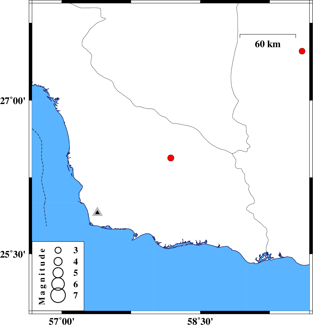 | 2020/08/08 | 01:32:37.4 | 06:02:37.4 | 27.477 | 59.6 | 12 | ML:3 | Sistan va Baloochestan Province, 112 km North-West of Iranshahr |