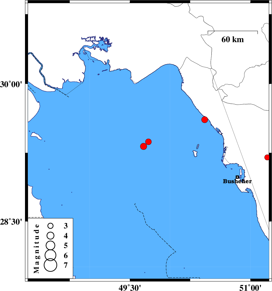 | 2020/09/18 | 04:14:26.6 | 08:44:26.6 | 29.37 | 49.73 | 23 | ML:3.4 | Persian Gulf, 96 km South of Hendijan | ||