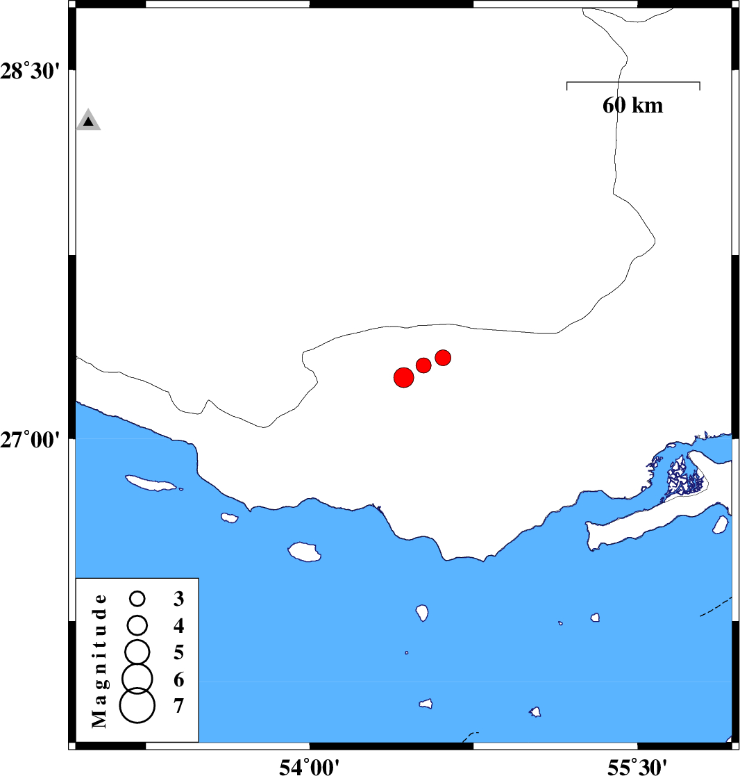 | 2020/10/14 | 17:51:26.6 | 21:21:26.6 | 27.33 | 54.61 | 20 | ML:3.3 | Hormozgan Province, 28 km North-East of Bastak | ||