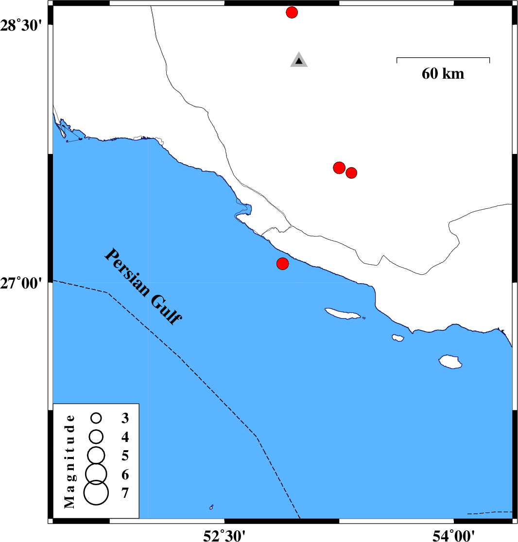| 2020/10/25 | 09:44:20.3 | 13:14:20.3 | 27.11 | 52.88 | 10 | ML:3.5 | Persian Gulf, 49 km South of Mehr | ||