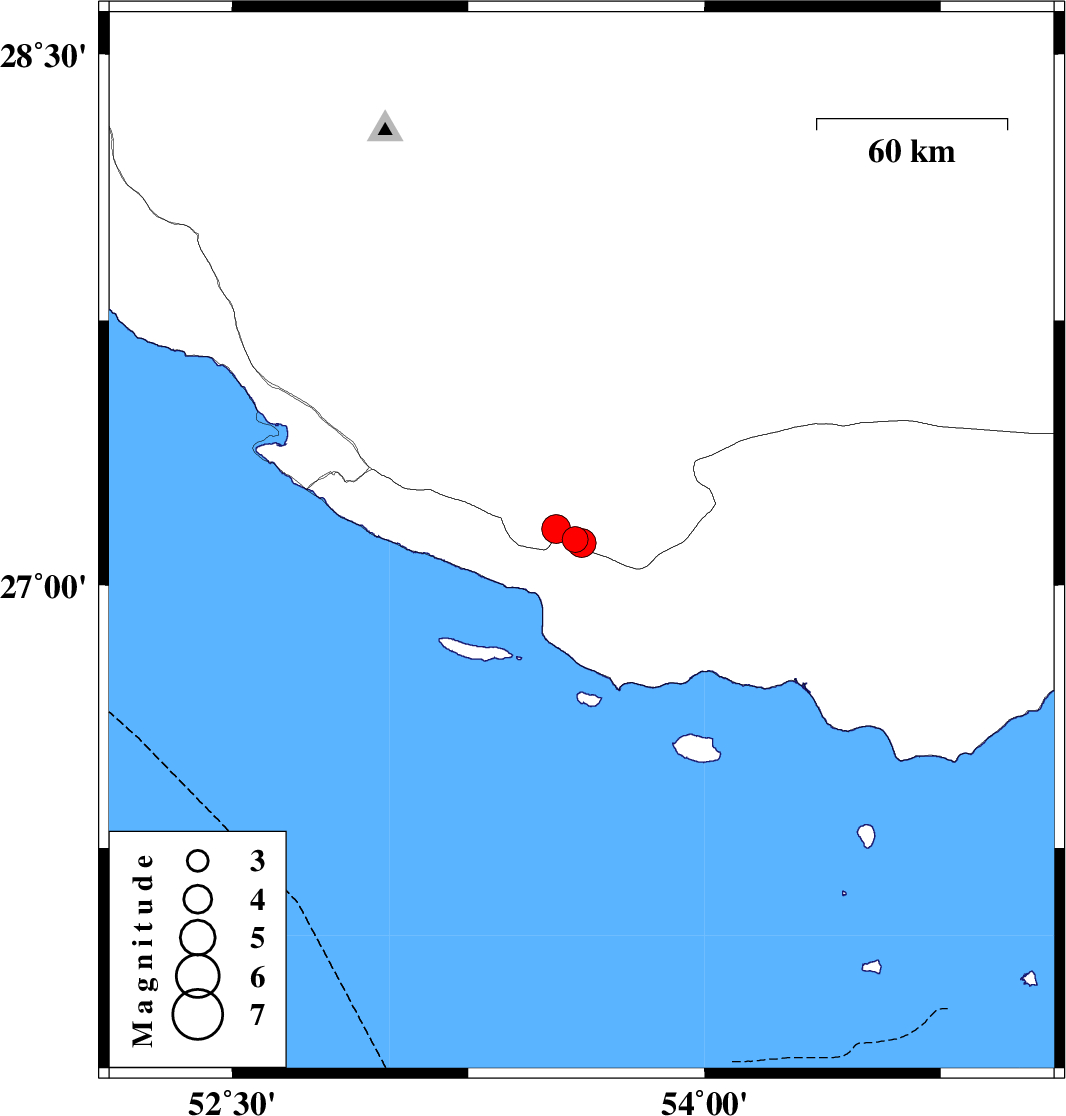 | 2020/11/05 | 04:05:43.6 | 07:35:43.6 | 27.16 | 53.53 | 32 | ML:4.1 | Fars Province, 41 km South-East of Lamerd |