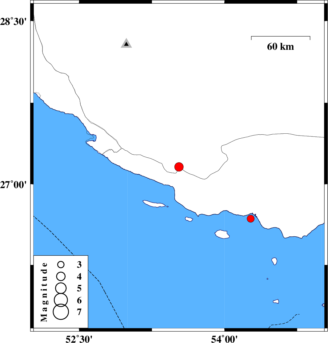 | 2020/10/30 | 19:22:36.3 | 22:52:36.3 | 26.68 | 54.27 | 10 | ML:3.4 | Persian Gulf, 58 km South of Bastak |