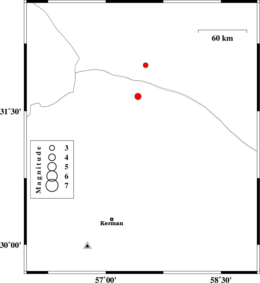 | 2020/11/25 | 21:47:52.3 | 01:17:52.3 | 30.85 | 57.37 | 10 | ML:3.8 | Kerman Province, 77 km -East of Zarand |
