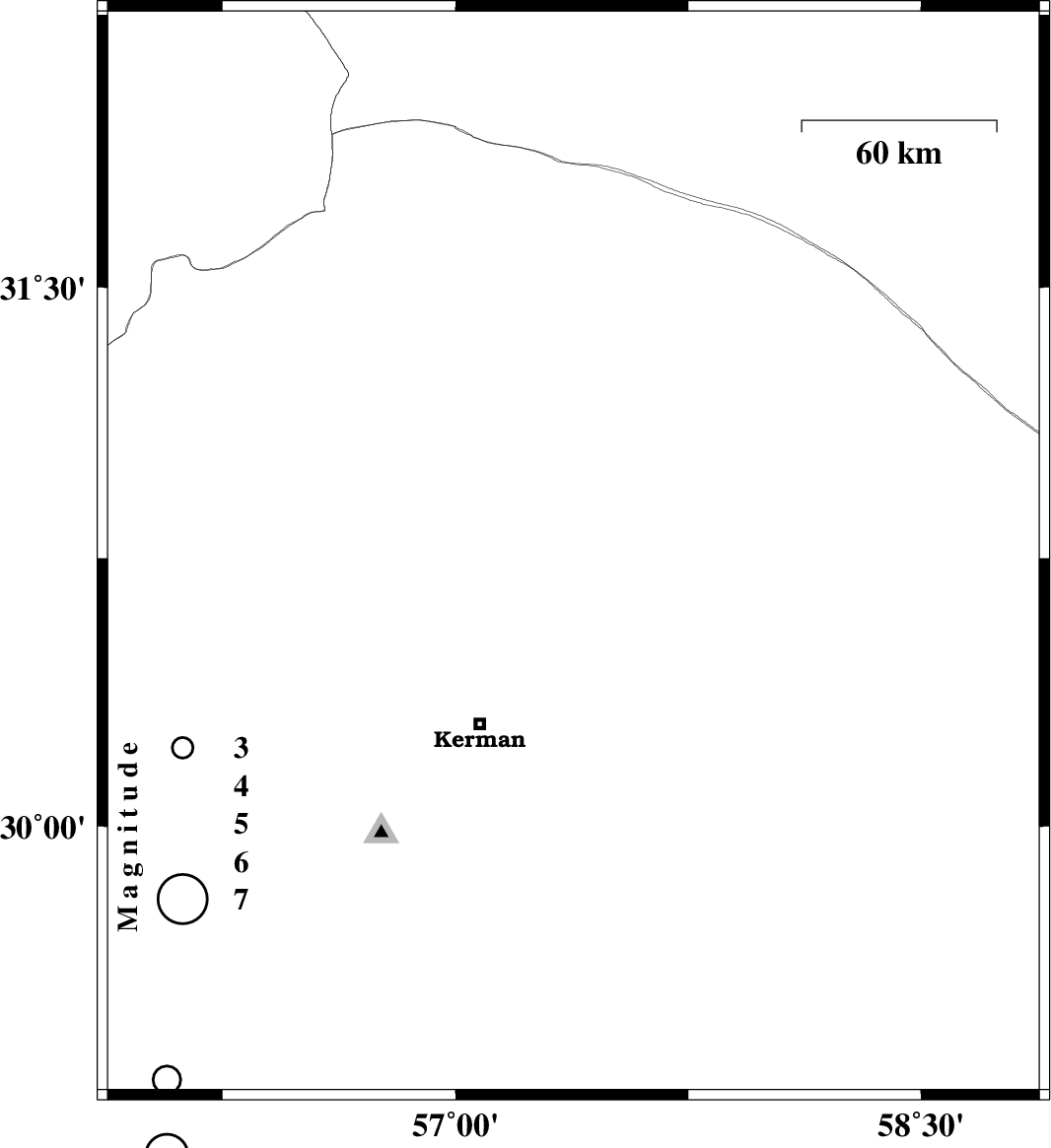 | 2020/11/27 | 04:13:28.7 | 07:43:28.7 | 30.76 | 57.38 | 10 | ML:3.2 | Kerman Province, 60 km North-East of Kerman | ||