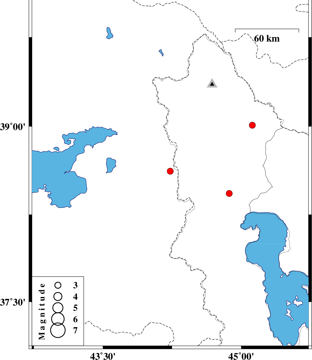 | 2020/11/19 | 06:53:17.8 | 10:23:17.8 | 39.01 | 45.12 | 10 | ML:3.1 | Azarbaijan Gharbi Province, 33 km South-West of Nakhicevan | ||