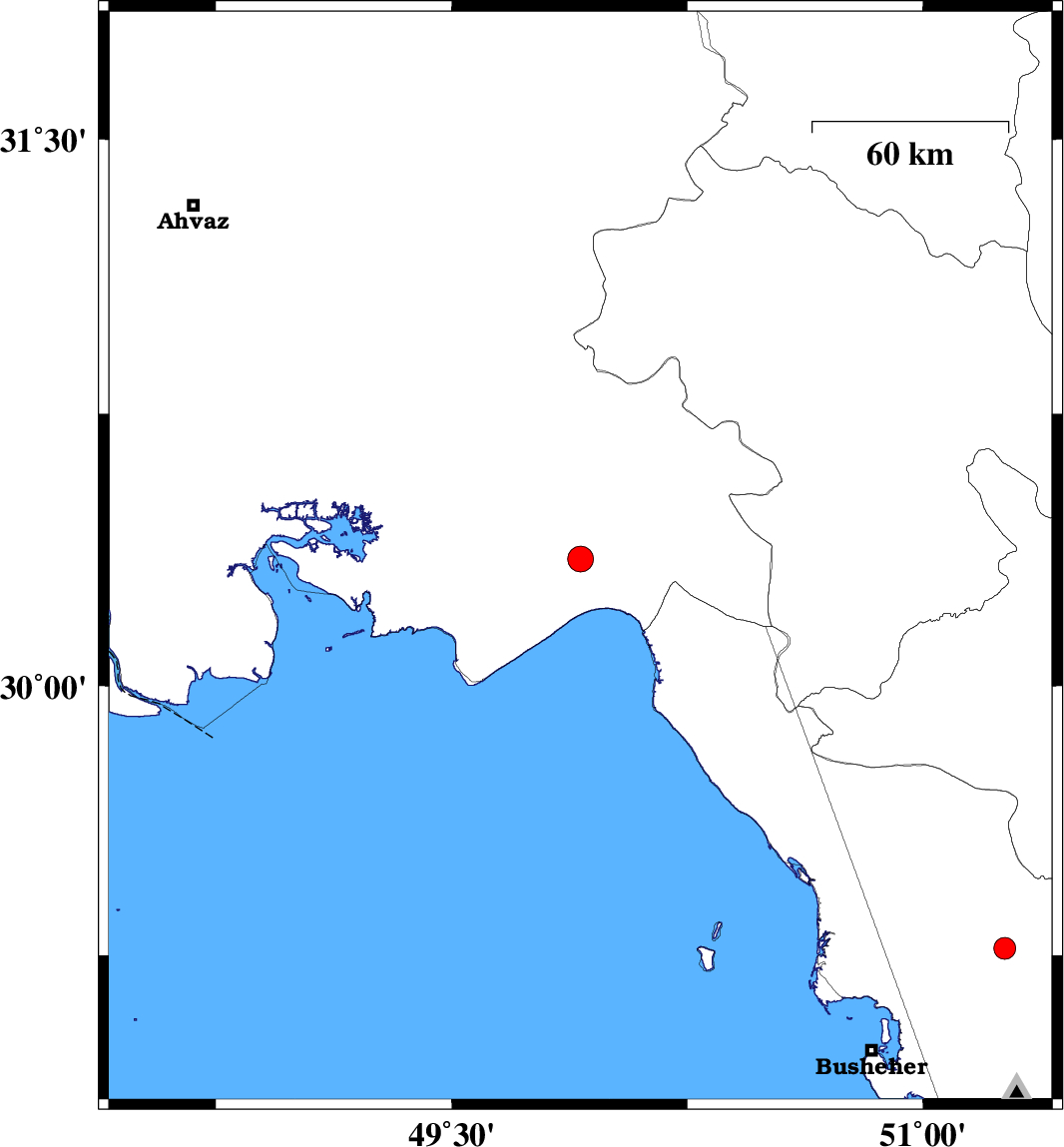 | 2020/11/26 | 12:48:16.2 | 16:18:16.2 | 29.27 | 51.26 | 10 | ML:3.1 | Bushehr Province, 5 km of Borazjan |