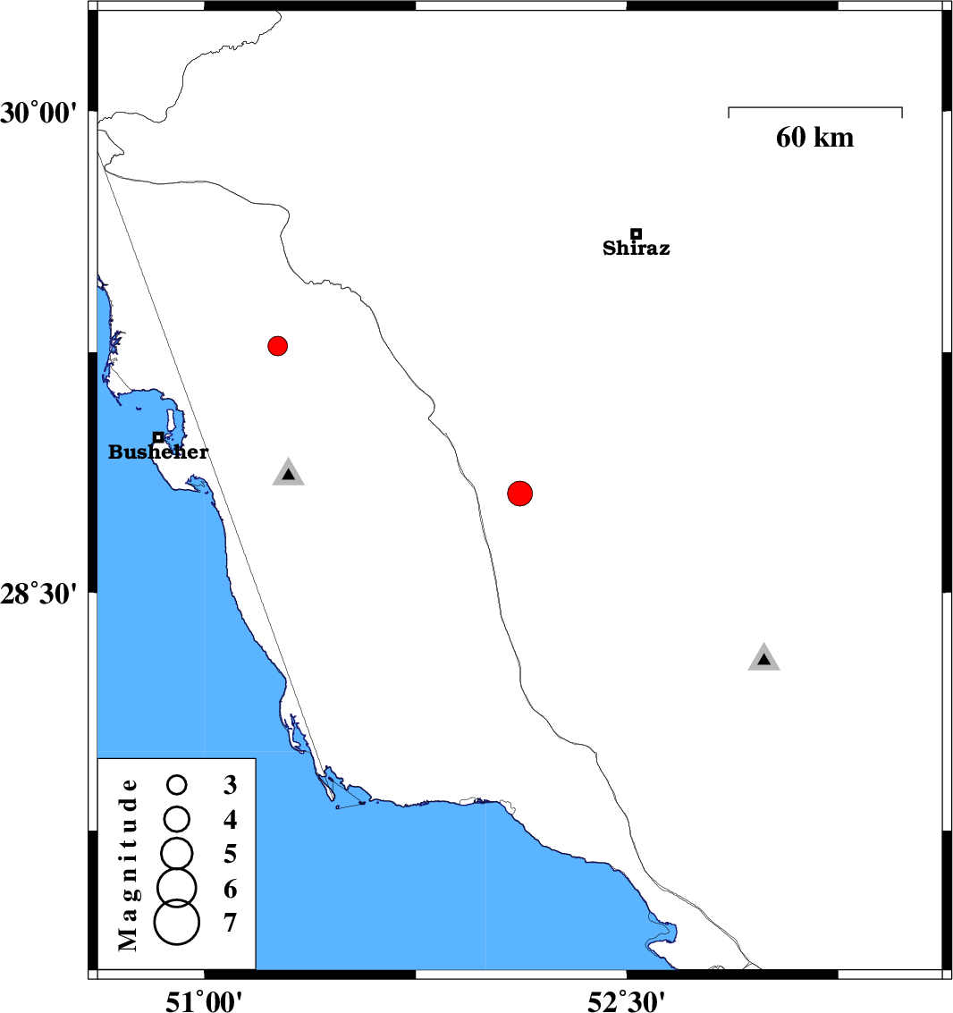 | 2020/11/26 | 12:48:16.2 | 16:18:16.2 | 29.27 | 51.26 | 10 | ML:3.1 | Bushehr Province, 5 km of Borazjan |