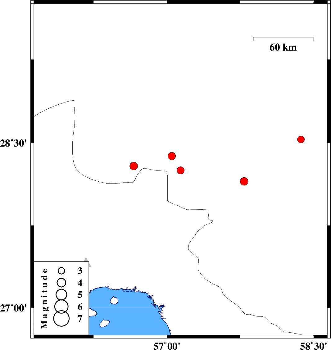 | 2020/12/22 | 21:29:46.2 | 00:59:46.2 | 28.53 | 58.37 | 10 | ML:3.3 | Kerman Province, 64 km South of Bam | ||