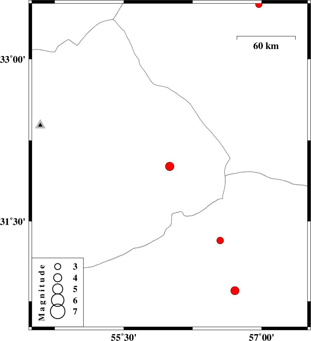 | 2020/12/12 | 06:28:32.0 | 09:58:32.0 | 31.32 | 56.55 | 10 | ML:3.4 | Kerman Province, 26 km -West of Ravar |