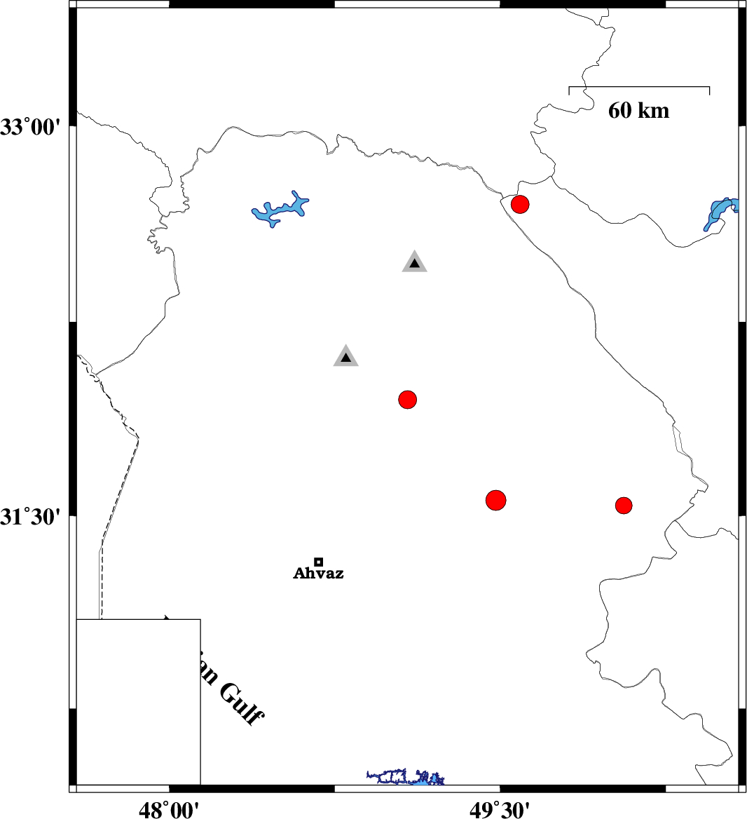 | 2020/12/27 | 15:56:52.3 | 19:26:52.3 | 31.56 | 49.48 | 10 | ML:4.1 | Khoozestan Province, 34 km North-West of Ramhormoz | ||