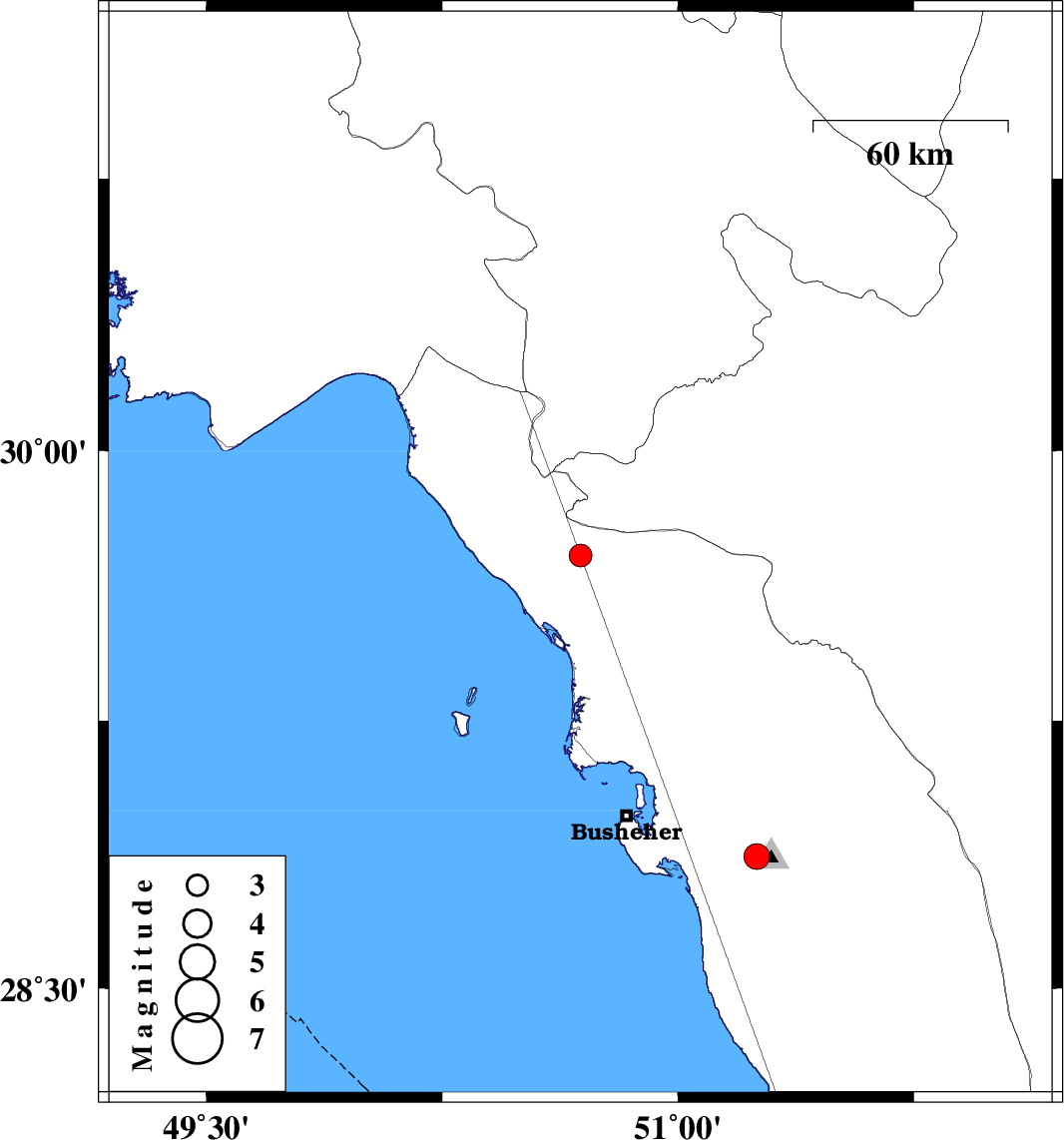 | 2021/01/05 | 13:20:03.5 | 16:50:03.5 | 29.71 | 50.69 | 25 | ML:3.2 | Bushehr Province, 23 km North-East of Bandar-e genaveh | ||