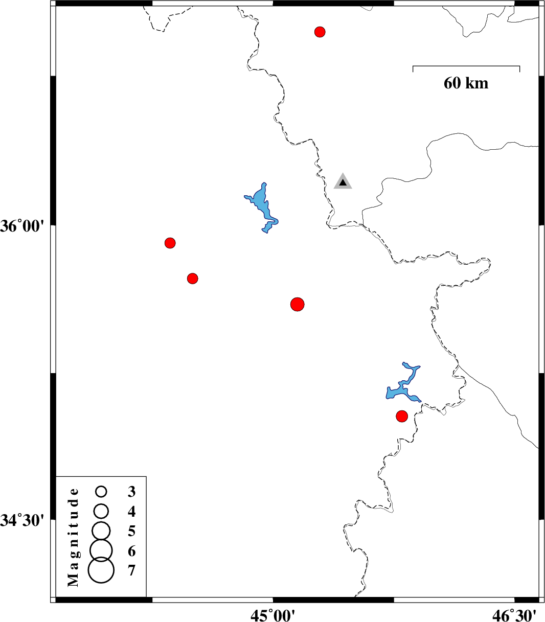 | 2020/12/30 | 04:13:43.2 | 07:43:43.2 | 35.73 | 44.5 | 10 | ML:2.9 | Iraq, 87 km North-West of Sulaymaniyah | ||