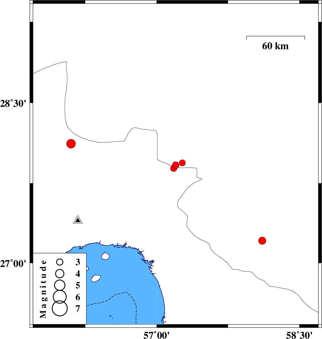 2021/01/25 20:29:39.1 23:59:39.1 27.8957.1810 ML:3.1 Hormozgan Province, 52 km North of Dehbarez