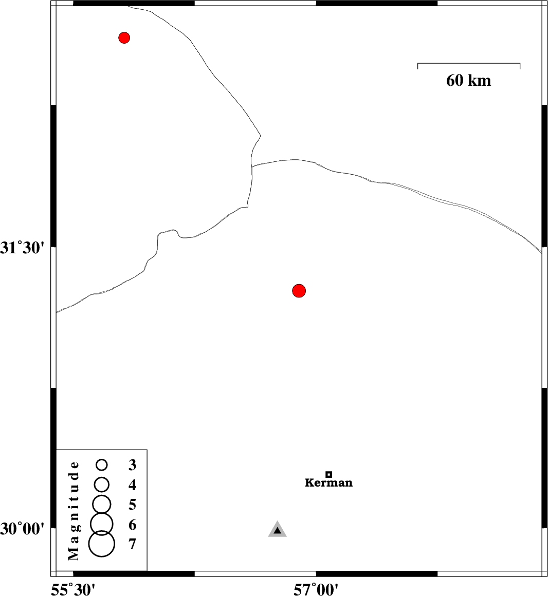 | 2021/04/12 | 08:44:55.0 | 13:14:55.0 | 31.268 | 56.894 | 12 | ML:3.6 | Kerman Province, 8 km of Ravar | ||