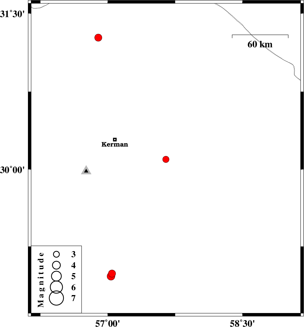 | 2021/04/11 | 17:26:57.4 | 21:56:57.4 | 28.958 | 57.036 | 20 | ML:4 | Kerman Province, 52 km South-East of Baft |