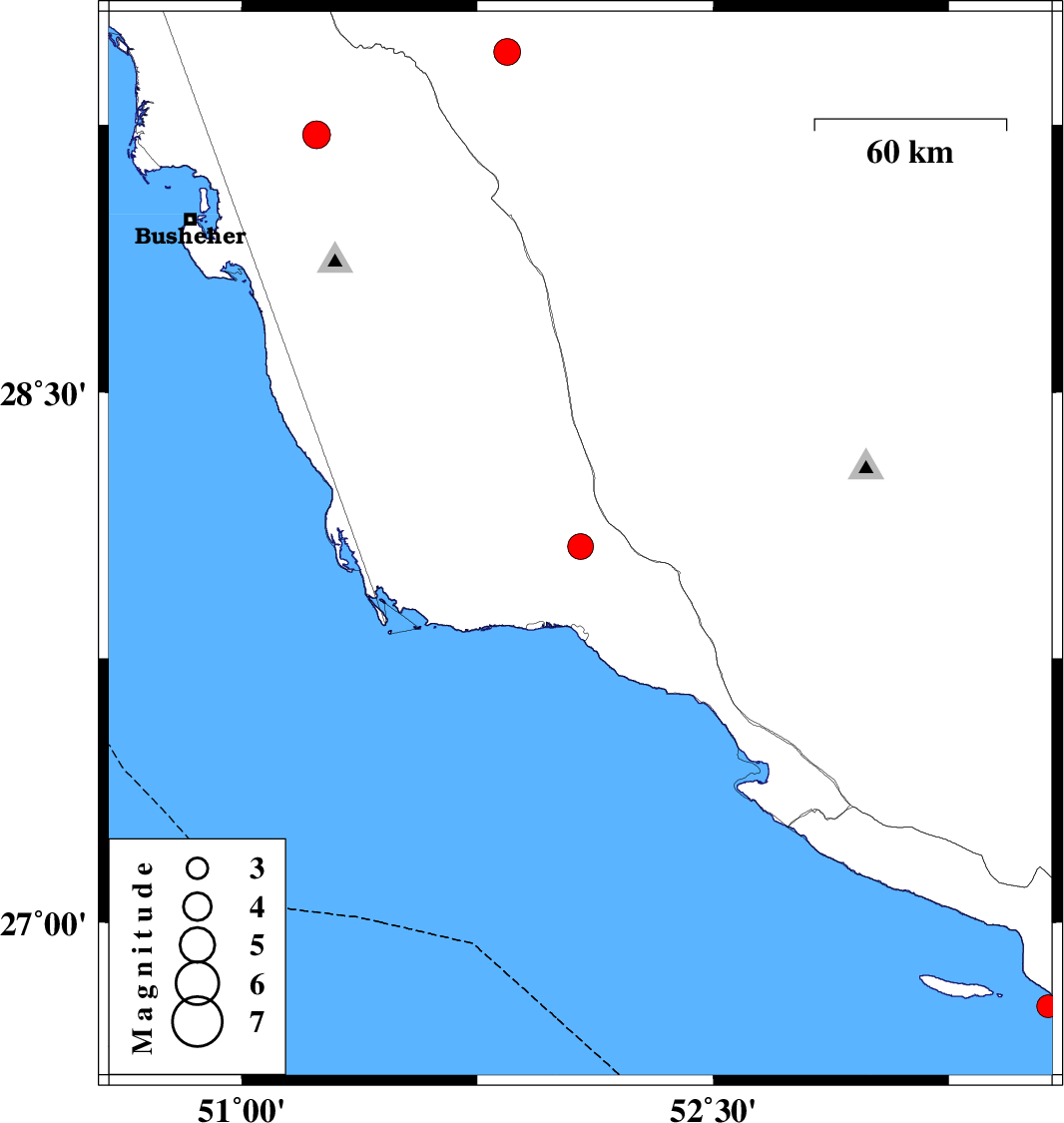 | 2021/06/20 | 00:03:24.1 | 04:33:24.1 | 28.066 | 52.078 | 12 | ML:3.6 | Bushehr Province, 27 km North of Bandar-e kangan | ||