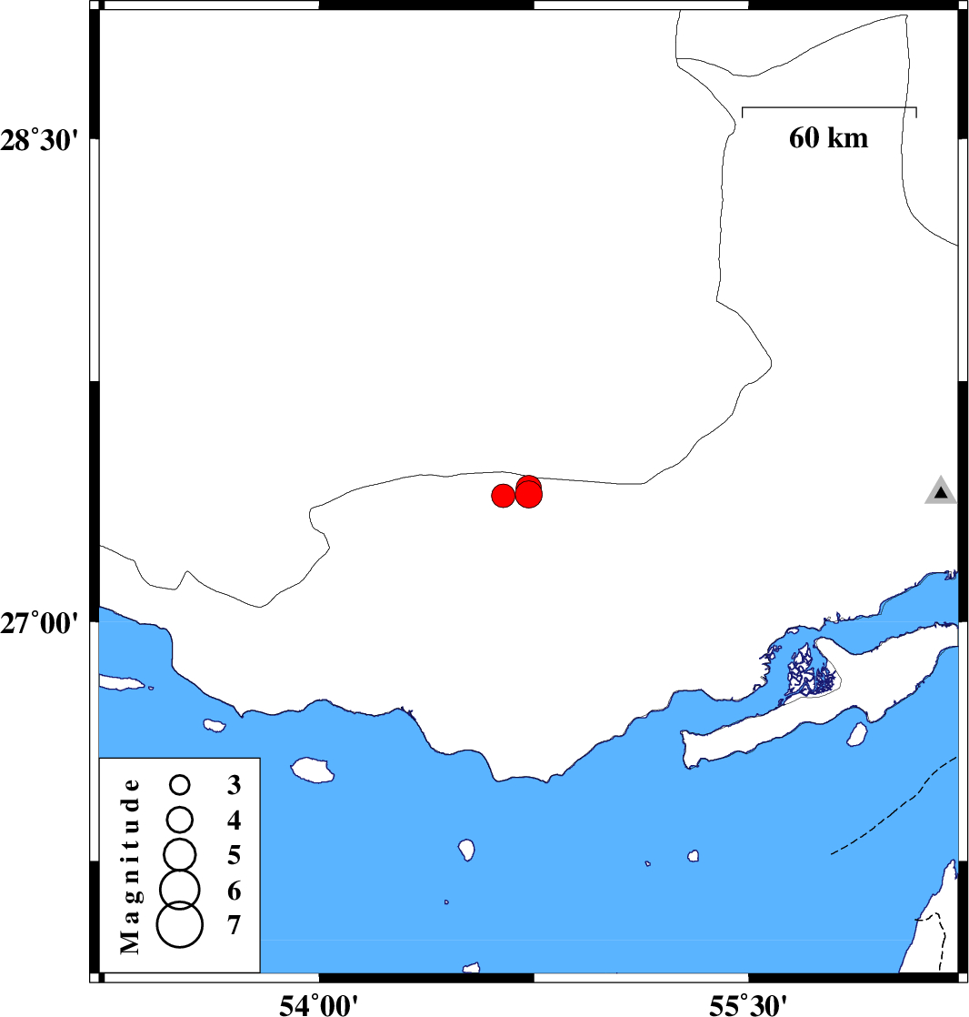 2021/09/11 | 20:55:23.5 | 01:25:23.5 | 27.417 | 54.731 | 19 | ML:4 | Hormozgan Province, 44 km North-East of Bastak |