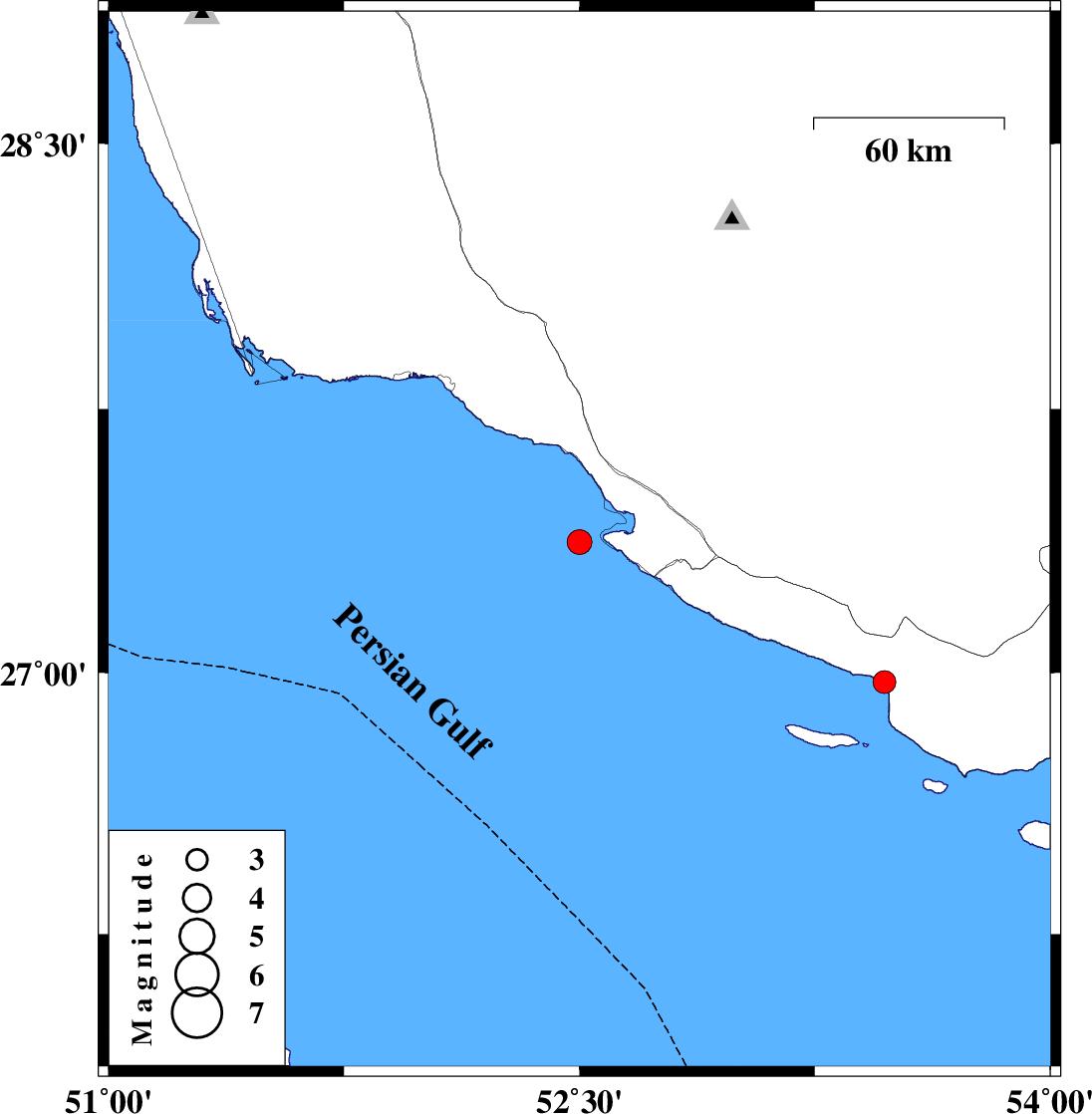 | 2021/09/19 | 22:11:08.1 | 02:41:08.1 | 27.372 | 52.5 | 12 | ML:3.5 | Persian Gulf, 43 km South-West of Mehr | ||