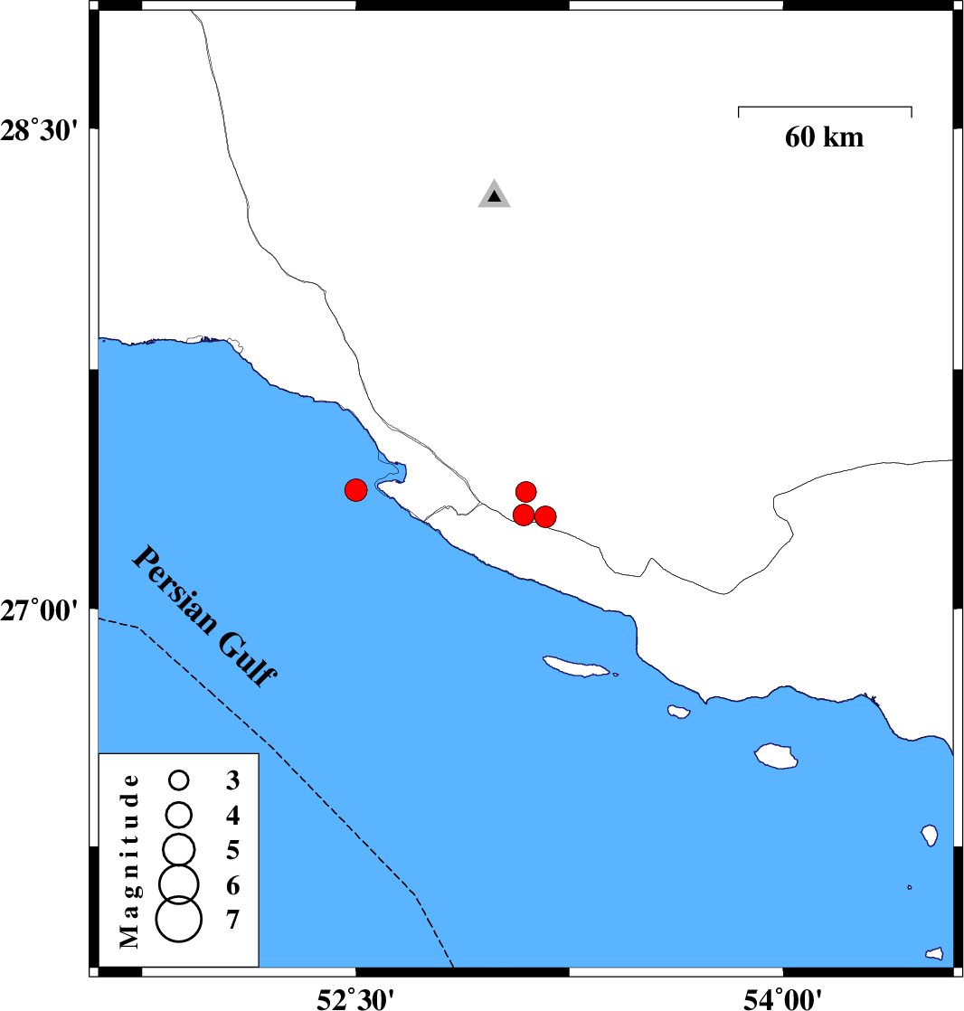 | 2021/09/19 | 22:11:08.1 | 02:41:08.1 | 27.372 | 52.5 | 12 | ML:3.5 | Persian Gulf, 43 km South-West of Mehr |