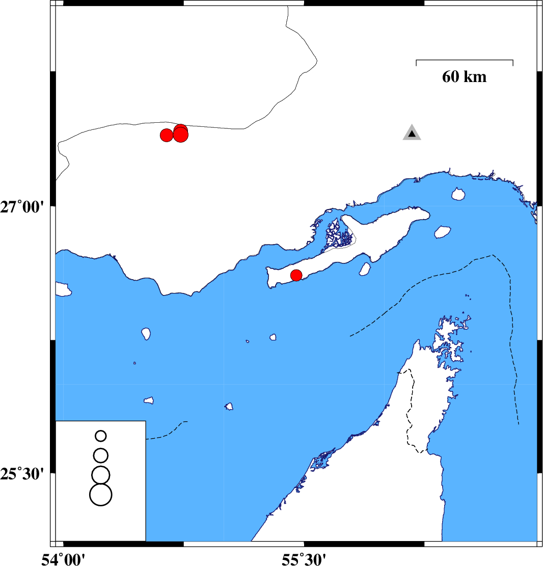 2021/09/30 | 10:29:00.7 | 13:59:00.7 | 26.613 | 55.451 | 16 | ML:3.3 | Persian Gulf, 61 km -East of Bandar-e lengeh | ||