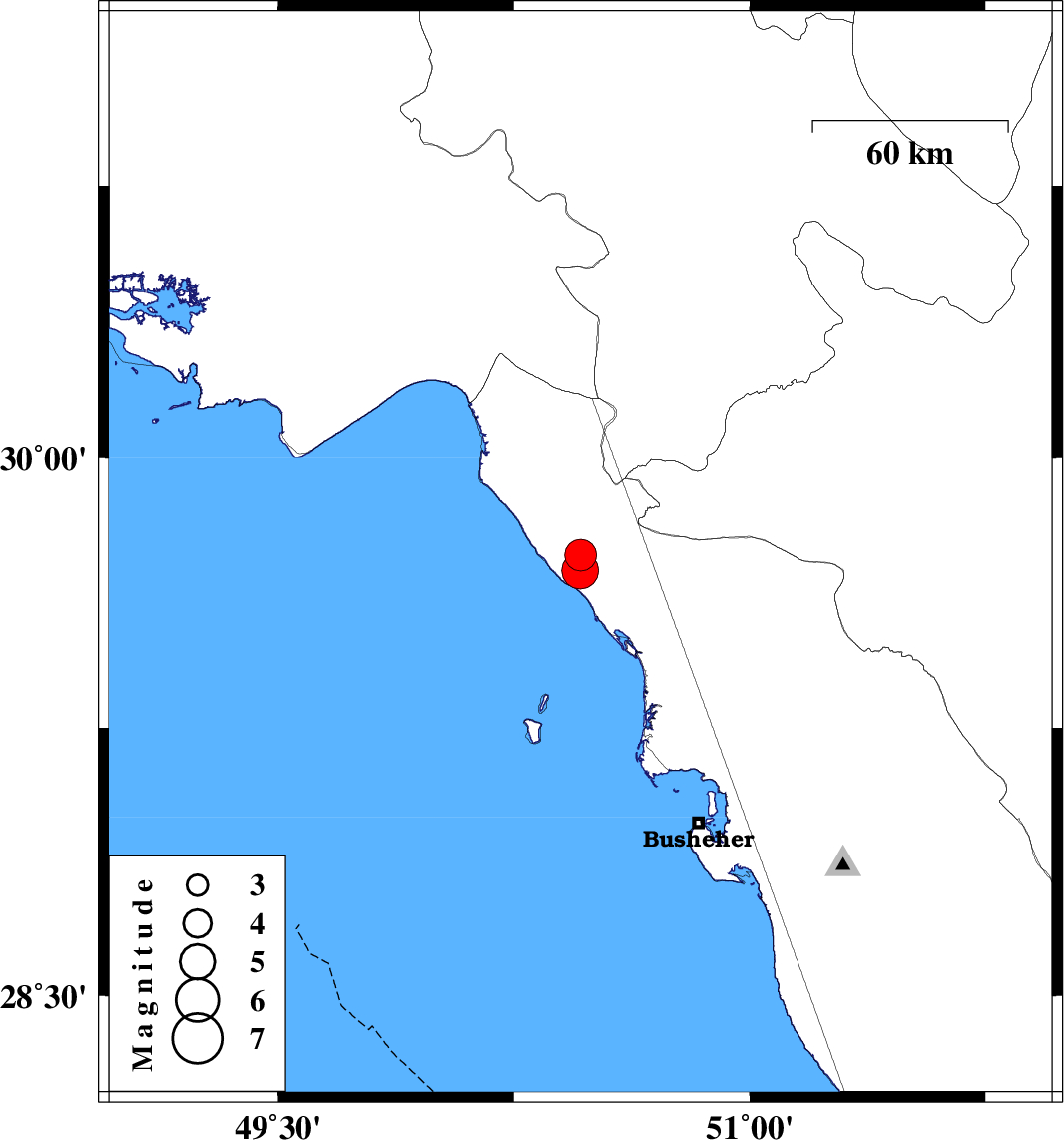 | 2021/10/01 | 01:15:19.8 | 04:45:19.8 | 29.687 | 50.461 | 10 | ML:5.2 | Bushehr Province, 13 km North of Bandar-e genaveh |