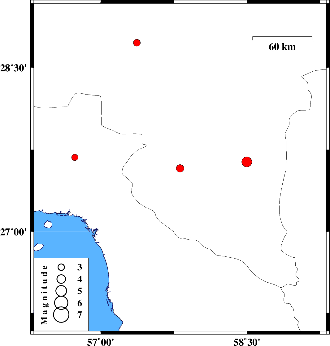 2021/10/21 | 06:05:14.8 | 09:35:14.8 | 27.639 | 58.498 | 12 | ML:4.7 | Kerman Province, 86 km South-East of Kahnuj | ||