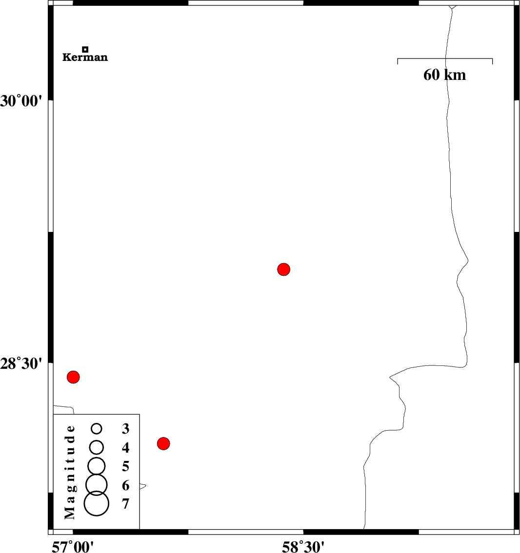 | 2021/11/30 | 03:35:31.9 | 07:05:31.9 | 28.417 | 57.001 | 12 | ML:3.7 | Kerman Province, 77 km South-West of Jiroft |
